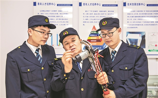 圖為該段技能大師周文剛(中)與小組青年職工試驗自制的動車組高壓電故障應急工裝設備。 劉路 張晉彤 攝
