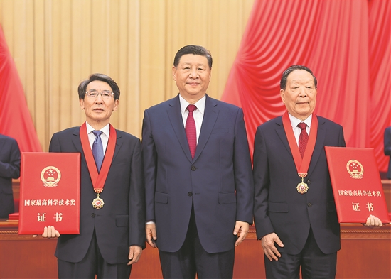 儀式號角響起,習(xí)近平首先向獲得2023年度國家最高科學(xué)技術(shù)獎的武漢大學(xué)李德仁院士和清華大學(xué)薛其坤院士頒發(fā)獎?wù)隆⒆C書,同他們熱情握手表示祝賀。隨后,習(xí)近平等黨和國家領(lǐng)導(dǎo)人同兩位最高獎獲得者一道,為獲得國家自然科學(xué)獎、國家技術(shù)發(fā)明獎、國家科學(xué)技術(shù)進步獎和中華人民共和國國際科學(xué)技術(shù)合作獎的代表頒發(fā)證書。