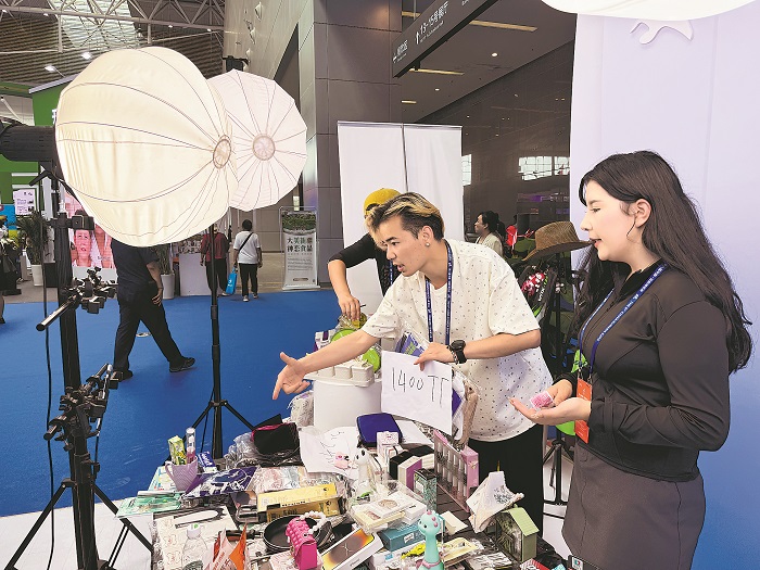 6月26日,參加第八屆中國—亞歐博覽會的一家電子商務公司在12號館內開啟現場直播,3位主播用哈薩克語向哈薩克斯坦的觀眾推介商品,包括牙刷牙膏、化妝品等眾多國產百貨。