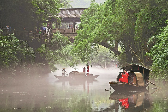 近日,在湖北省宜昌市三峽人家龍進溪景區,游客們在山間步道上漫步,在竹林掩映中欣賞峽江漁船,感受曾經三峽漁民的水上生活。據了解,三峽人家是5A級旅游景區,位于西陵峽中段,是三峽僅存的保持原始三峽風貌的區域。它將巴楚文化、土家文化、碼頭文化等融入自然奇景中,以文旅融合展示峽江風情。本報記者 吳凡 攝