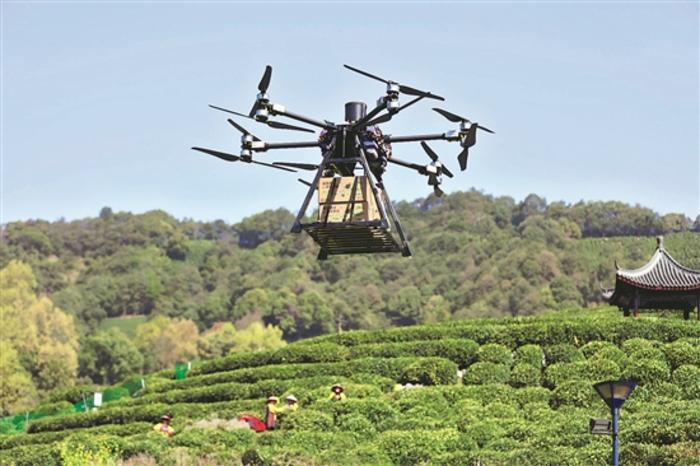 圖為3月29日,在浙江省杭州市西湖區龍井村,順豐無人機飛行在茶園上空運送春茶。本報記者 甘皙 本報通訊員 魏志陽 攝