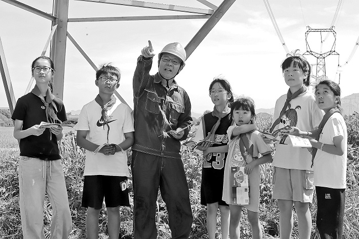 暑期來臨之際,小學生們來到電塔下,聽電力工人講避雷防雷常識。