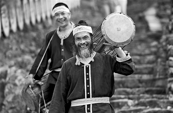 7月10日,廣西金秀瑤族自治縣六巷鄉六巷村下古陳屯,兩位非遺傳承人帶著黃泥鼓去表演。六巷村是當地有名的“非遺村”。非遺已成為助力當地發展的重要“助推器”。