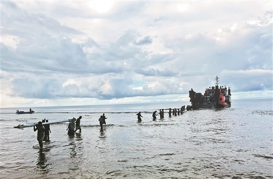 中國援助所羅門群島國家寬帶網絡項目是兩國標志性合作項目之一,由中國港灣工程有限責任公司和華為技術有限公司共同實施,按規劃將在所羅門群島9個省的35個主要島嶼建設161個3G/4G無線通信基站。項目2023年8月開工,工期3年,首個電信塔已于今年3月在瓜達爾卡納爾省薩利村接通。圖為近日,在所羅門群島瓜達爾卡納爾省,當地村民搬運中國援助寬帶網絡項目所需的物資。新華社發