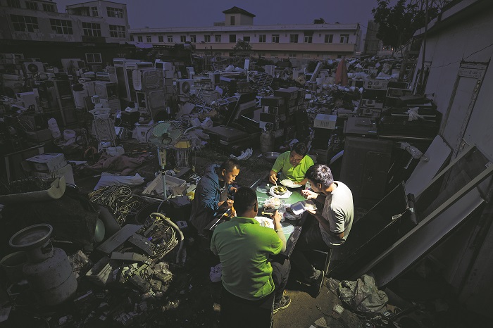 7月3日晚,忙碌了一天的家電回收員正在回收站的一處空地上吃晚飯。
