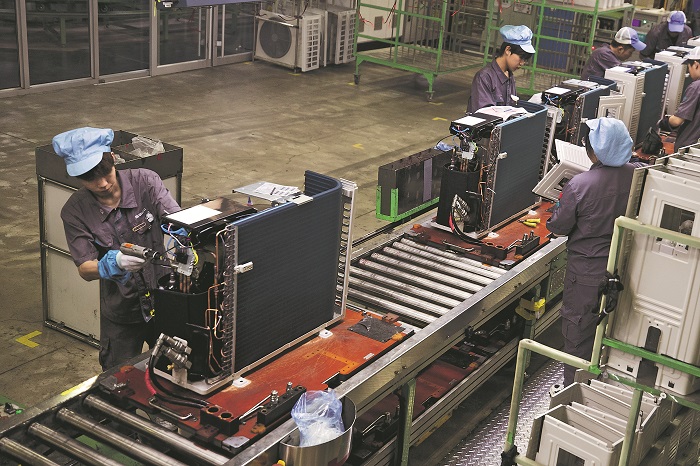 7月8日,一處空調生產車間內,工人正在流水線上組裝空調。