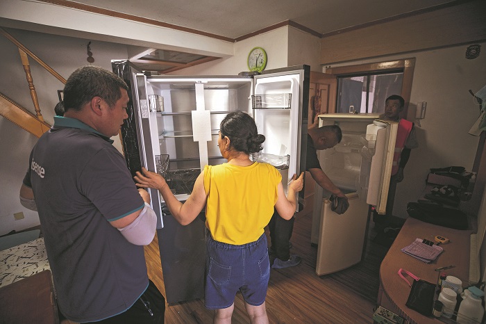 7月6日,一位市民(左二)在家里查看新購買的冰箱。她的舊冰箱也將被收走,最終被送往拆解工廠。