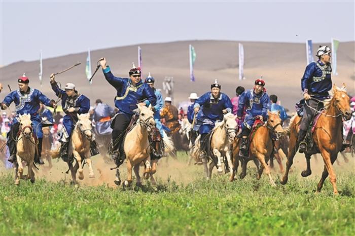 7月14日,“相約草原·遇見那達(dá)慕”內(nèi)蒙古第34屆草原那達(dá)慕在錫林郭勒盟開幕。本屆那達(dá)慕開幕式由“相約草原”“亮麗北疆”“守望相助”3部分組成,樂器、歌舞等演出精彩紛呈,吸引游客前來感受草原文化。