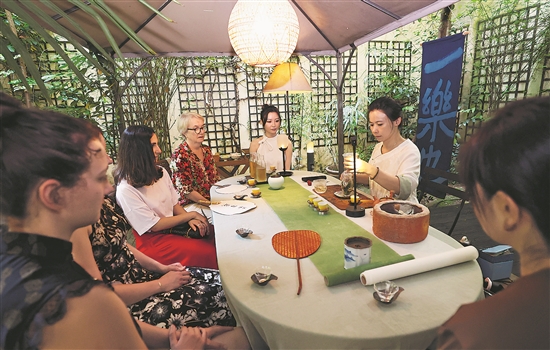 茶藝師張樂2022年在法國巴黎創立了“一樂也”中國茶工作室,每周在充滿中式園林風情的小院里為來自法國、中國、摩洛哥、日本等地的學生上一到兩次茶藝課。此外,她還在當地中小學、文化機構等擔任茶藝教師。張樂表示,通過她的展示和介紹,很多人看到了中國茶的好,愛上了中國茶,還在自己家里置辦了茶桌,和家人分享。