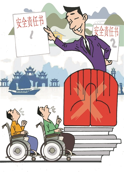 據(jù)華商網(wǎng)報道,近日,陜西西安兩名殘障人士前往某景點游玩,入園前被要求簽署安全責(zé)任書:“殘疾人如無成年人陪同,入園后的一切安全責(zé)任與景區(qū)無關(guān)。”兩人感到被歧視,經(jīng)過交涉,園方拿出第二份責(zé)任書,依然要求“殘障人士需由有監(jiān)護能力的游客陪同”。