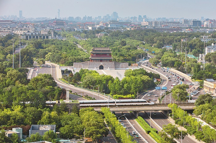 圖為7月27日,復(fù)興號動車組列車經(jīng)過位于北京中軸線上的永定門前。