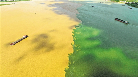 7月25日,江西省九江市湖口縣,長江和鄱陽湖交匯。長江水系渾濁,鄱陽湖水系清澈,在江湖匯合處形成涇渭分明的“江湖兩色”奇特景觀。傅建斌 攝/視覺中國