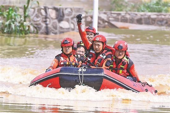 7月29日,在吉林省臨江市,臨江市消防救援大隊(duì)世紀(jì)大街站副站長白云天(右二)在轉(zhuǎn)運(yùn)受困群眾時(shí),用手勢(shì)指揮隊(duì)員操控船只。