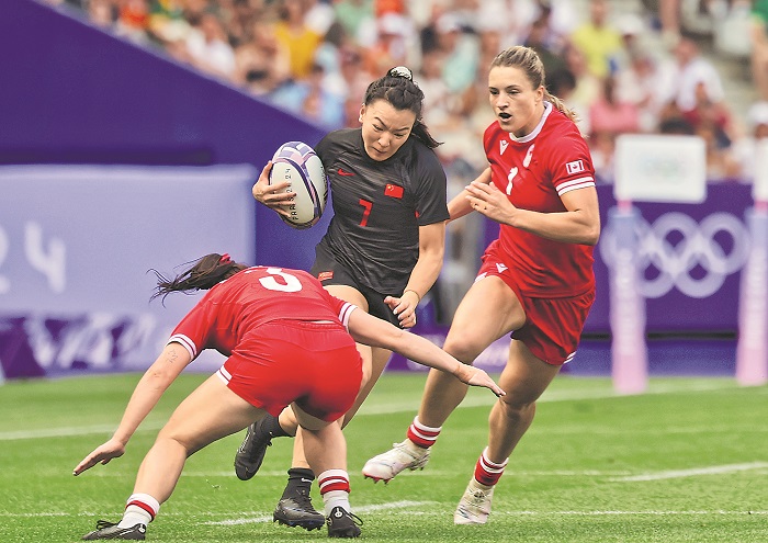 北京時間7月30日晚,中國女子橄欖球隊在巴黎奧運會7人制橄欖球女子5~8名排名賽中以19:15戰勝英國隊。東京奧運會收獲第7名的中國女橄刷新了歷史最好成績。圖為中國隊在分組循環賽中對陣加拿大隊。本報特派記者 楊登峰 攝