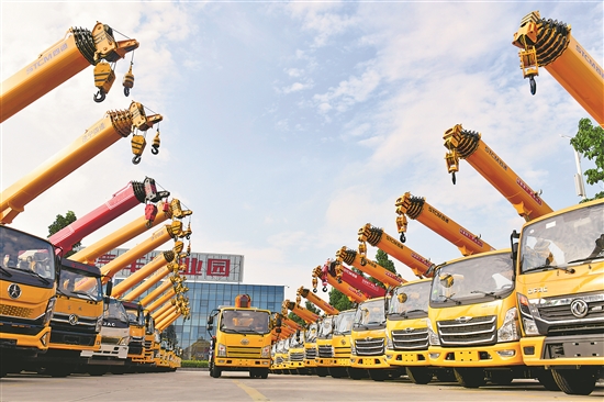 8月4日,在濟寧四通工程機械有限公司總裝車間,一輛吊車開往堆場。