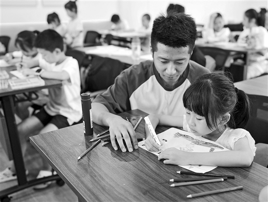 為解決外來務工家庭暑假“帶娃難”的問題,浙江湖州吳興區愛山街道整合企業工會、幸福鄰里等資源,開設“小候鳥”文明課堂,開展趣味手工、實踐體驗等課程,讓孩子們度過一個快樂暑假。圖為企業志愿者帶著“小候鳥”開展繪畫活動。