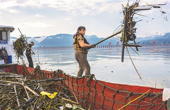 8月6日,清漂工人在三峽大壩上游湖北省宜昌市秭歸縣水域清理水上漂浮物。
