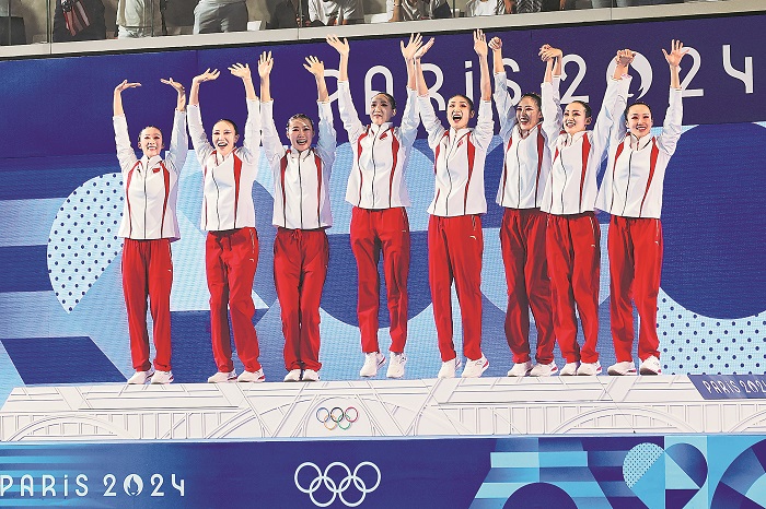 本報巴黎8月8日電(特派記者畢振山)當地時間8月7日晚,巴黎奧運會花樣游泳集體項目的最后一項集體技巧自選在巴黎奧林匹克水上運動中心舉行,由馮雨、常昊、王賜月、王柳懿、王芊懿、向玢璇、肖雁寧、張雅怡組成的中國隊獲得283.6934分。加上此前集體技術自選和集體自由自選得分,中國隊總分達到996.1389分,以領先第二名80多分的成績奪得冠軍。