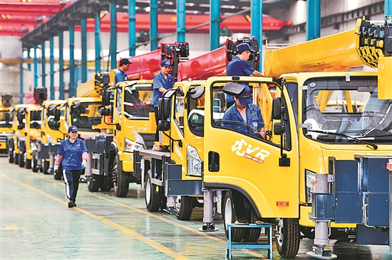 8月4日,在濟(jì)寧四通工程機(jī)械有限公司總裝車間,工作人員在吊車生產(chǎn)線上工作。