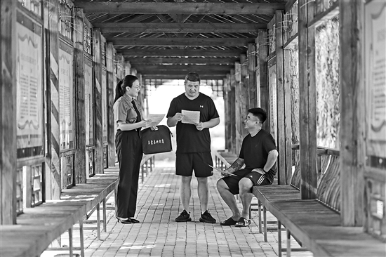 8月7日,遼寧阜新蒙古族自治縣人民檢察院檢察人員在于寺鎮官營子村向村民進行普法宣傳。當日,檢察人員通過座談交流、發放普法宣傳單等方式,針對電信詐騙、土地糾紛、非法集資等鄉村常見法律問題進行普法宣傳,提高村民法律意識。新華社記者 龍雷 攝
