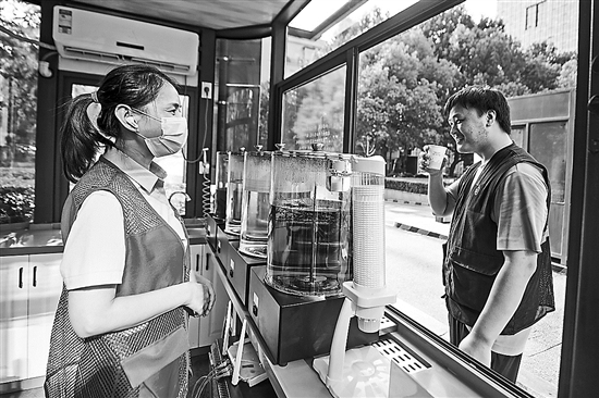 8月6日,快遞員(右)在杭州德力西大廈公益涼茶攤喝涼茶解暑。