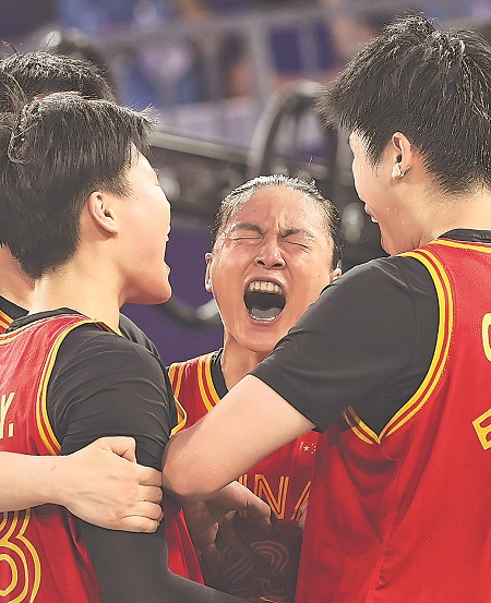 7月31日,在三人籃球女子分組循環賽中,中國隊戰勝法國隊后高興地擁抱在一起。