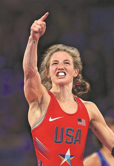 8月7日,摔跤女子自由式50公斤級半決賽,美國選手莎拉·安戰勝對手后慶祝勝利。