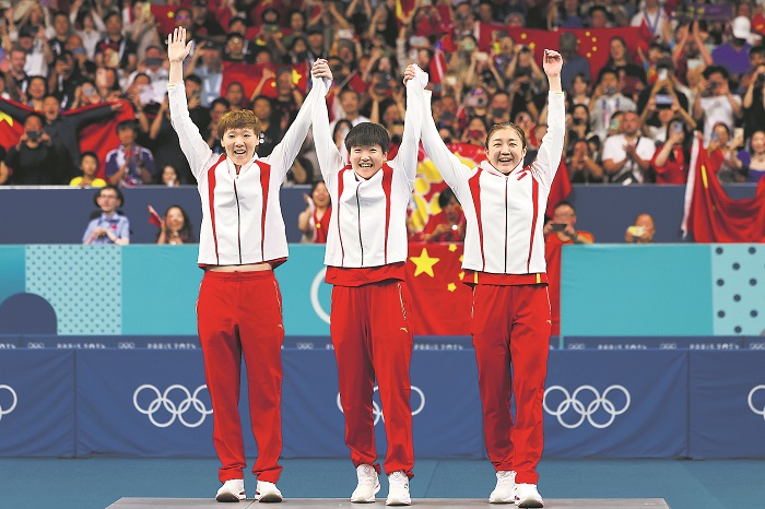 本報(bào)巴黎8月10日電(特派記者畢振山)當(dāng)?shù)貢r(shí)間8月10日下午,在巴黎奧運(yùn)會(huì)乒乓球女子團(tuán)體決賽中,由陳夢(mèng)、孫穎莎、王曼昱組成的中國(guó)隊(duì)以3比0戰(zhàn)勝日本隊(duì),奪得金牌。至此,國(guó)乒包攬了本屆奧運(yùn)會(huì)乒乓球項(xiàng)目5枚金牌。