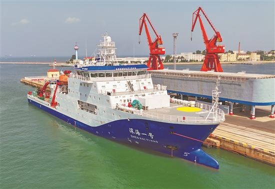 8月11日,在青島大港碼頭,“深海一號”遠洋科考船即將離境。當日,在青島辦結完出入境船舶監管手續后,攜“蛟龍號”載人潛水器的“深海一號”解纜離境,赴西太平洋海域開展科考工作。新華社發(張進剛 攝)