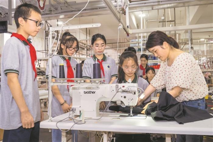 日前,安徽省合肥市第四十五中工業區分校中學生走進合肥廬陽經濟開發區轄區清華勝嘉服飾有限公司服裝生產車間,體驗服裝文化和“智”造工藝。