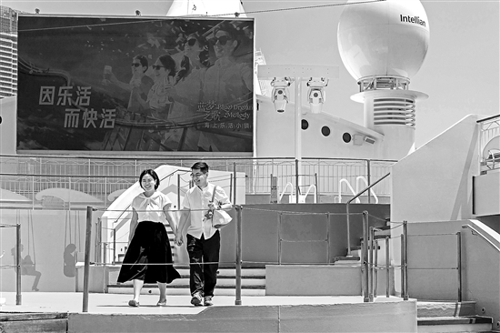 8月9日,一對(duì)新人在“藍(lán)夢(mèng)之歌”郵輪上參觀。