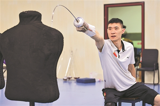 8月12日,中國輪椅擊劍集訓隊(江蘇組)運動員仲賽春在訓練中。新華社發(fā)(蘇陽 攝)