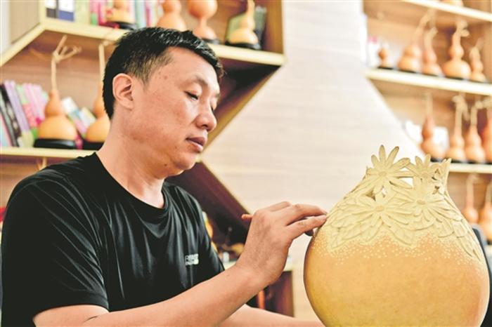 8月10日,在山東省濟寧市微山縣驩城鎮西田陳村福祿葫蘆合作社,村民在制作文創葫蘆。