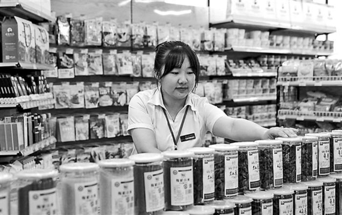 8月14日,工作人員在位于遼寧省朝陽市的喀左站的便利店中碼放鄉村特色農副商品。