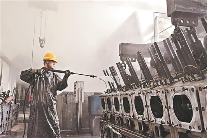 在中國鐵路鄭州局集團有限公司新鄉機務段機車配件清洗庫內,有3個大小不一的清洗池,水溫高達100攝氏度,清洗工需要在悶熱潮濕的環境中作業,徹底清洗配件內的油泥、積碳等雜質,以確保機車配件質量。圖為配件清洗工對高溫煮洗后的機體進行清洗。袁修航 攝