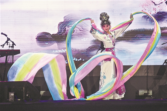 當地時間8月17日,在巴西首都巴西利亞,來自浙江婺劇藝術研究院的演員在沙灘藝術節中國日活動上表演。新華社發(盧西奧·塔沃拉 攝)