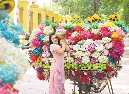 近日,一名身著奧黛的越南女子在河內街頭一處鮮花流動攤前留影。越南首都河內是一座愛花的城市,夜晚的鮮花批發市場車水馬龍,白晝里的賣花流動攤遍布大街小巷,多彩的鮮花點綴了河內的旖麗風光。新華社記者 劉天 攝