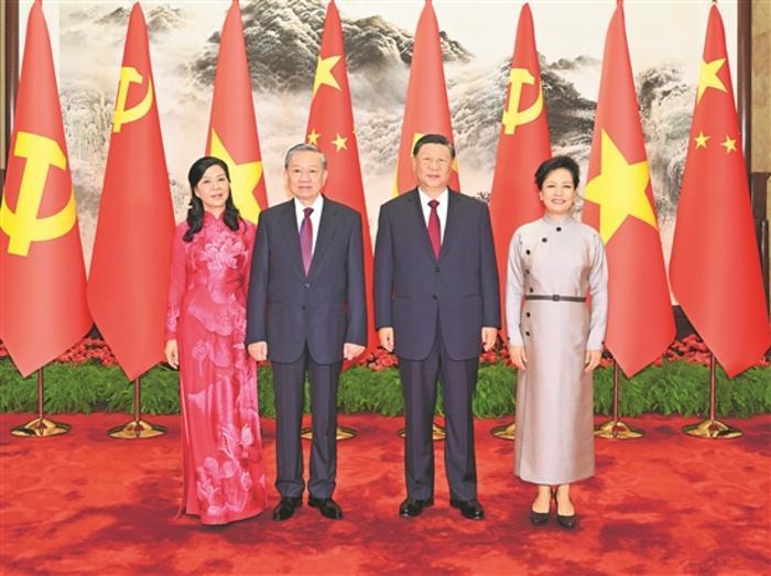 習(xí)近平指出,面對(duì)世界之變、時(shí)代之變、歷史之變,中越兩國保持經(jīng)濟(jì)快速發(fā)展和社會(huì)長期穩(wěn)定,彰顯了社會(huì)主義制度的優(yōu)越性和社會(huì)主義事業(yè)的生命力。中方將越南作為周邊外交優(yōu)先方向,支持越南堅(jiān)持黨的領(lǐng)導(dǎo),走符合本國國情的社會(huì)主義道路,深入推進(jìn)革新開放和社會(huì)主義現(xiàn)代化事業(yè)。在各自國家發(fā)展振興的關(guān)鍵時(shí)期,中越要把準(zhǔn)命運(yùn)共同體建設(shè)的方向,夯實(shí)政治互信更高、安全合作更實(shí)、務(wù)實(shí)合作更深、民意基礎(chǔ)更牢、多邊協(xié)調(diào)配合更緊、分歧管控解決更好的“六個(gè)更”發(fā)展格局。中方愿同越方保持密切戰(zhàn)略溝通和高層交往,堅(jiān)定相互支持,積極探討拓展共建“一帶一路”倡議和“兩廊一圈”框架對(duì)接合作,加快推進(jìn)鐵路、高速公路、口岸基礎(chǔ)設(shè)施“硬聯(lián)通”,提升智慧海關(guān)“軟聯(lián)通”,攜手打造安全、穩(wěn)定的產(chǎn)業(yè)鏈供應(yīng)鏈。以明年慶祝中越建交75周年為契機(jī),共同舉辦好“中越人文交流年”等系列活動(dòng),鞏固兩國民意根基。雙方要秉持和平共處五項(xiàng)原則等國際關(guān)系基本準(zhǔn)則,推動(dòng)平等有序的世界多極化、普惠包容的經(jīng)濟(jì)全球化,維護(hù)國際公平正義和發(fā)展中國家共同利益,推動(dòng)構(gòu)建人類命運(yùn)共同體。