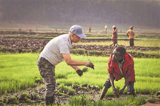 近日,在盧旺達(dá)南方省胡耶區(qū),水稻專家鄭瑞金(左)在稻田里指導(dǎo)當(dāng)?shù)氐巨r(nóng)進(jìn)行秧苗移栽。