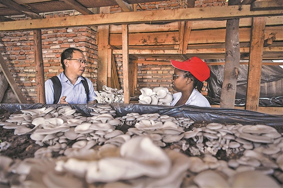 近日,在盧旺達(dá)首都基加利的一家食用菌培育作坊,菌草專家陳曉斌(左)向作坊主人蘇珊娜·尼庫澤提供指導(dǎo)。陳曉斌在示范中心工作近6年,他指導(dǎo)當(dāng)?shù)剞r(nóng)民從事菌草培育,見證了很多從事食用菌培育的當(dāng)?shù)剞r(nóng)戶生活變得越來越好。