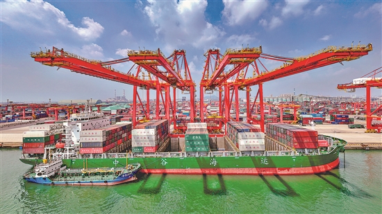 8月22日,在山東港口日照港集裝箱碼頭,輪船在停泊作業。2024年1月至7月,日照港貨物吞吐量同比增長6.1%,集裝箱量同比增長11.1%。其中,外貿集裝箱吞吐量同比增長13.2%,呈現穩中向好的發展態勢。