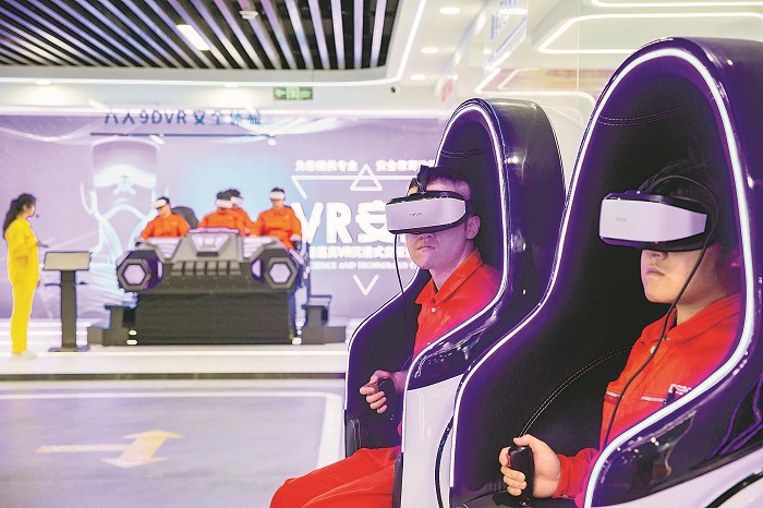 8月21日,在中國能建易普力股份有限公司新疆準東經(jīng)濟技術(shù)開發(fā)區(qū)的智能化安全體驗培訓中心,新入職職工正進行崗前培訓,通過VR模擬爆破飛石、排土場翻車事故等警示案例,提高職工安全生產(chǎn)意識。近年來,中國能建易普力公司在新疆準東宜化五彩灣一號露天煤礦進行智能化設(shè)備改造,推進礦山向智能化、綠色化轉(zhuǎn)型。本報記者 王偉偉 攝