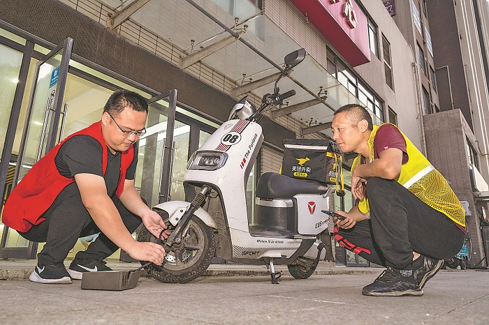 8月21日,在安徽省合肥市廬陽經濟開發區永清社區黨群服務中心,志愿者正在給一名外賣配送員檢測電瓶車胎壓。今年以來,廬陽經濟開發區總工會依托社區黨群服務中心,為新就業形態勞動者提供早8點至晚8點納涼取暖、飲水熱飯、手機充電等免費服務,讓他們可以“歇歇腳”“加加油”,安全再出發。本報通訊員 趙明 攝