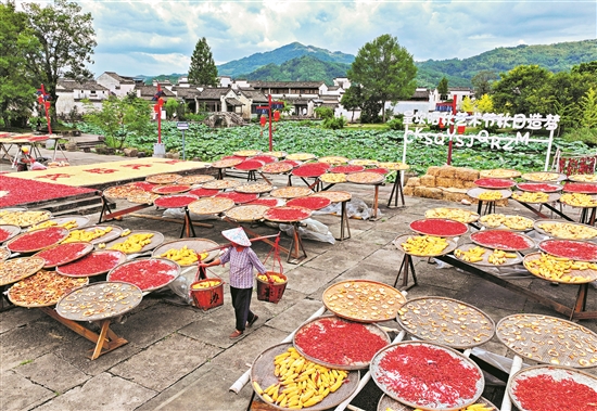 進入秋季,安徽省黃山市徽州區呈坎村村民趁著晴好天氣,晾曬玉米、南瓜、紅辣椒等農作物,吸引不少游客前往觀賞,感受豐收的喜悅,也增加了村民的收入。