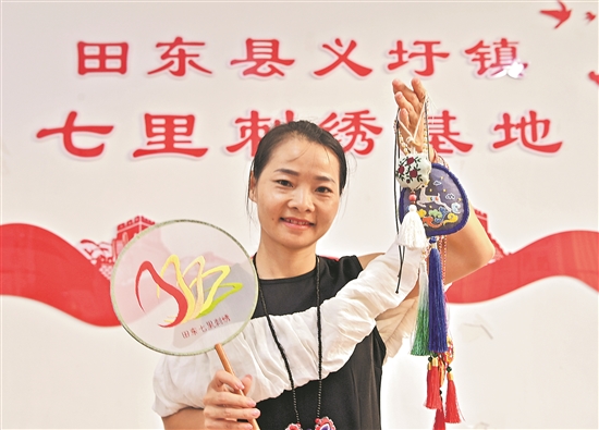 1986年出生的凌漫麗是田東縣七里刺繡非物質文化遺產傳承人。為打造七里刺繡品牌,打開七里刺繡手工藝品銷路,她多年潛心研究,創新開發了團扇、香囊、鑰匙扣等刺繡工藝品,并在社交平臺進行銷售。在義圩鎮,凌漫麗已帶動200多名婦女通過刺繡增加收入,其中很多是刺繡能手。
