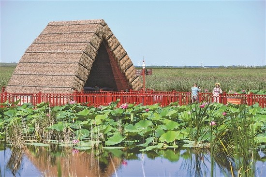 8月26日,游客在吉林省松原市查干湖參觀游覽。