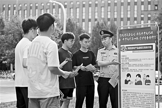 9月5日,在天津大學北洋園校區,公安民警為大學生宣傳網絡游戲產品虛假交易類詐騙防范知識。當日,天津市公安局刑偵總隊、內保總隊在天津大學開展“開學反詐第一課”集中宣傳活動。 新華社記者 孫凡越 攝
