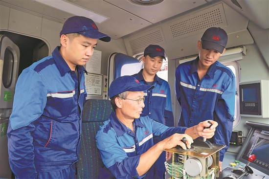 為了讓老撾員工能夠真正掌握鐵路行業的各項技能,中老鐵路萬象運營管理中心推出“師帶徒”制度,組織中方員工與老方員工結成師徒關系。圖為近日,在中老鐵路萬象運營管理中心的機車檢修庫里,中老師徒4人一同對機車部件進行攻關。新華社發 (鄭皓文 攝)