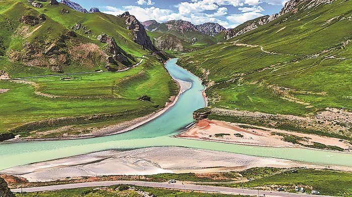 瀾滄江源北源之一布當曲與干流扎曲的交匯處涇渭分明,一些游客自駕到該處賞景游玩。