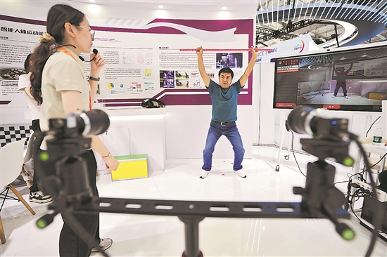 9月12日,在服貿會首鋼園區的健康衛生服務專區,一名參觀者在體驗一款人體運動能力評估系統。